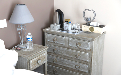Chambre 2 personnes, lit 160 x 200, salle de bain avec douche, lavabo et WC. Vue sur jardin. Accessible PMR. TV. WIFI. Plateau de courtoisie
