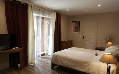 Chambre 2 à 4 personnes avec salon, lit 160 x 200, possibilité d'un ou deux lits de 90 supplémentaires, salle de bain avec douche, lavabo et WC. Accessible PMR. TV. WIFI. Plateau de courtoisie. Terrasse avec vue sur jardin